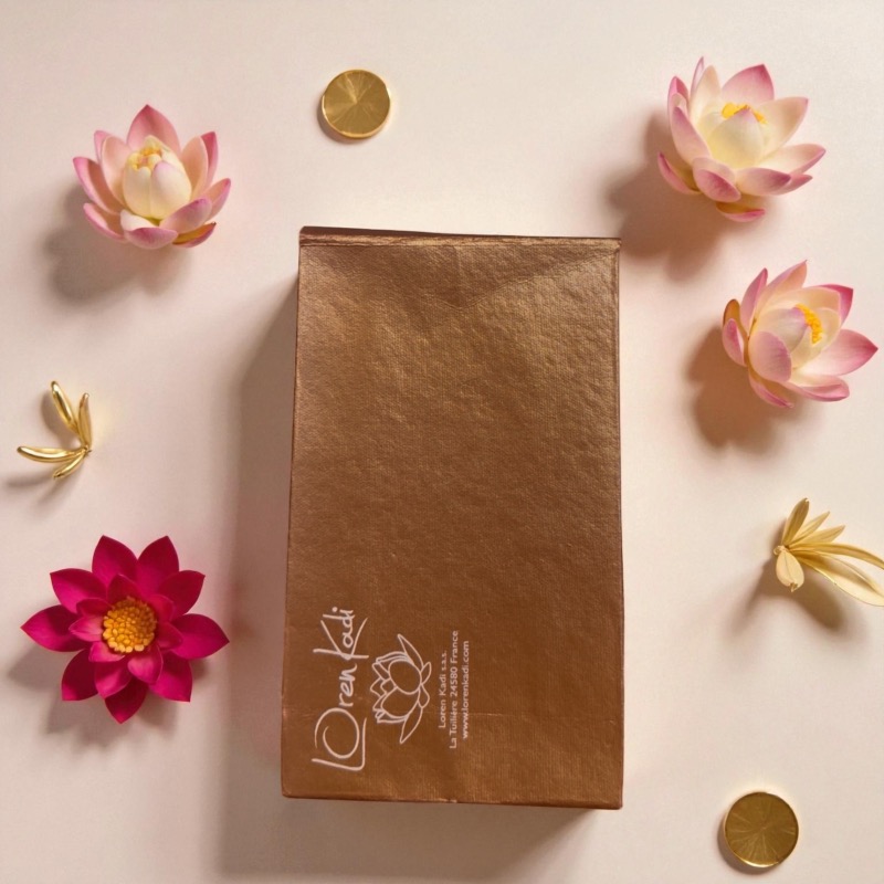Grande pochette à rabat (11x5,5 h.18 cm) en papier couleur cuivre, sans bois, au toucher doux avec logo à fleur de lotus Loren Kadi. Pour à 2 à 3 produits en 50 gr ou 210 ml (2 bouteilles).
